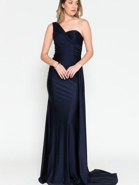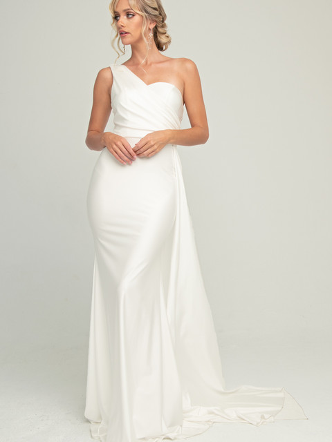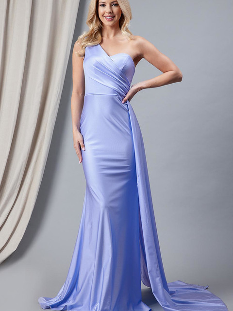 This elegant gown features a one shoulder design fit & flare with a side cape attached at the waist.