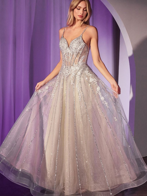 Looking like you got ready to be a star, this gorgeous gown features beadwork along the bodice with a daring deep-V neckline on a glitter a-line silhouette.