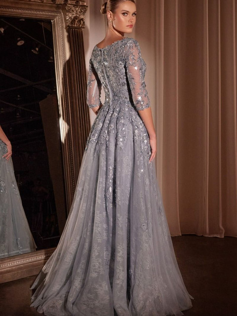 From holding her hand to fixing her veil, This gown is perfect for the moment 🤍. This gown features a tulle and lace material on an a-line bottom, a lined bodice with illusion neckline, full zipper back, and fitted mesh 3/4-length long sleeves.